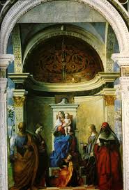 The focus of the art so far had been on mastering drawing and perspective. In Venice a new group was also emerging who treated colour with more importance than anybody, including the three Florentine masters had done before. The first of these was Giovanni Bellini 1431-1516. Bellini brought the oil painting begun by Van Eyck to Italy and you can see an example of his good use of colour, as well as light and shade, on the garments of the figures in his Madonna with saints 1508.