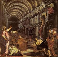 Perhaps the most successful artistically of the Mannerists were Tintoretto (1518-1594). Tintoretto was one artist who wanted ‘to unite the drawing of Michelangelo with the colour of Titian’ and he confronted the problem of keeping art refreshing very well by choosing more elaborate and exciting subject matter for his works. In his paintings there is much more of a story to be told than in the work of his predecessors as you can see in a painting like ‘the finding of St Marks remains’ from 1562. This painting shows men on the right going through catacombs, trying to find the remains of St Mark. They have already pulled out the right corpse which lies on the floor on the left and St Mark appears standing next to it in a ghostly vision holding up his hand ordering them to stop disturbing more bodies. There is also a demon seen leaving a man who had been possessed on the right hand side to add further content so there is a lot going on and the same can be said for many of his works.